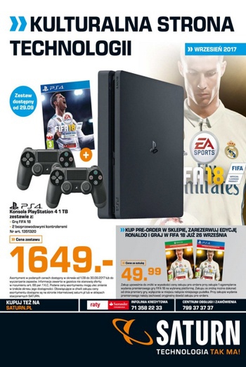 {loadposition linkMediaMarkt} Nowa gazetka promocyjna Saturn - "Kulturalna strona technologii". Polecane promocje z gazetki Saturn: Konsola PlayStation 4 1TB + gra FIFA 18 + 2 bezprzewodowe kontrolery - 1649 zł. Gra PS4 NBA 2K18 - 269 zł. Gra Xbox…