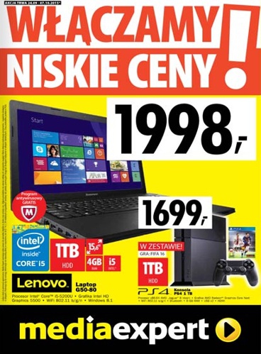 {loadposition linkMediaExpert} Nowa gazetka promocyjna Media Expert - "Włączamy niskie ceny!". Polecane promocje z gazetki Media Expert: Laptop LENOVO G50-80 - 1998 zł. Konsola PS4 1 TB - 1699 zł. Laptop HP PAVILION 15-p209nw - 1799 zł. Oferta…