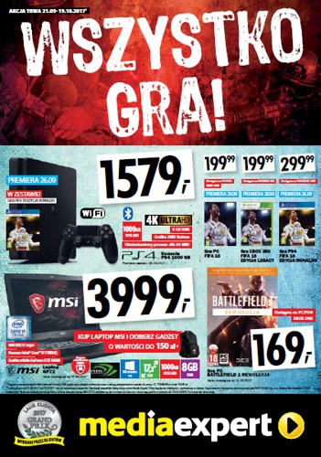 {loadposition linkMediaExpert} Nowa gazetka promocyjna sieci sklepów Media Expert - "Wszystko gra!". Polecane promocje z gazetki Media Expert: Konsola PS4 1 TB - 1579 zł. Laptop MSI GP72 - 3999 zł. Gra FIFA 18 - 199,99 zł. …