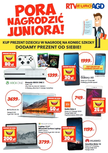 'Pora nagrodzić Juniora!' - nowa gazetka promocyjna RTV EURO AGD. Kup prezent dziecku w nagrodę na koniec szkoły, a RTV EURO AGD doda prezent od siebie! Polecane promocje z gazetki RTV EURO AGD: Konsola Xbox One S + 2…