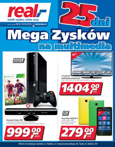 Nowa gazetka promocyjna sieci handlowej Real - "25 dni Mega Zysków na multimedia". Polecane promocje z gazetki Real: Telewizor LED 40" SAMSUNG UE40H5303 - 1404 zł. Konsola Xbox 360 500 GB + gry - 999 zł. Smartfon Nokia…