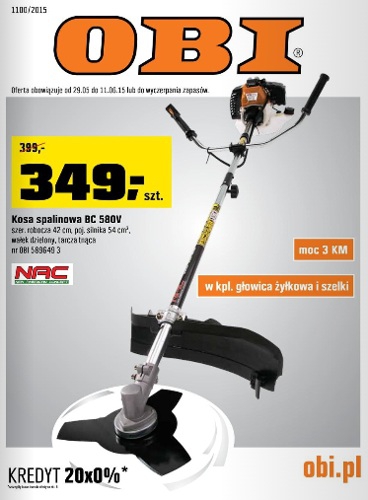 {loadposition linkObi} Nowa gazetka promocyjna Obi. Polecane promocje z gazetki Obi: Kosa spalinowa NAC BC 580V - 349 zł. Kosiarka spalinowa NAC - 1099 zł. Komplet mebli Vera - 699 zł. Oferta ważna od 9.06 do 22.06 lub…