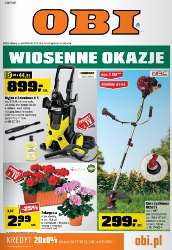 {loadposition linkObi} Nowa gazetka promocyjna Obi - "Wiosenne okazje". Polecane promocje z gazetki Obi: Myjka ciśnieniowa Karcher K5 - 899 zł. Kosa spalinowa NAC BC520V - 299 zł. Pelargonia w doniczce - 2,99 zł. Oferta ważna od 28.04…