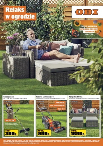 {loadposition linkObi} 'Relaks w ogrodzie' - nowa gazetka promocyjna sieci marketów Obi. Polecane promocje z gazetki Obi: Kosa spalinowa - 399 zł. Kosiarka spalinowa 3w1 - 899 zł. Komplet mebli Olea - 1699 zł. Oferta ważna od…
