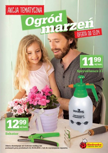 {loadposition linkBiedronka} Nowa gazetka promocyjna sieci handlowej Biedronka - "Ogród marzeń". Polecane promocje z gazetki sieci Biedronka: Spryskiwacz 2 L - 11,99 zł. Sekator - 12,99 zł. Kosiarka elektryczna - 179 zł. Oferta ważna od 13.04 do 26.04.