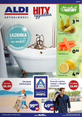 {loadposition linkAldi} Nowa gazetka promocyjna Aldi - "Łazienka na medal!". Polecane promocje z gazetki Aldi: Chodzik edukacyjny - 99 zł. Koszula męska indygo z długim rękawem - 49 zł. Marchew 1 kg - 0,85 zł. Oferta…