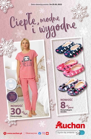 {loadposition linkAuchan5} 'Ciepłe, modne i wygodne' - nowa gazetka promocyjna sieci supermarketów Auchan. Polecane promocje z gazetki Auchan: Piżama damska - 30 zł. Skarpetopapcie damskie - 8 zł. Koszula nocna damska - 20 zł. Oferta ważna od…