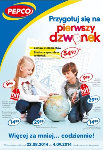 {loadposition linkPepco} Nowa gazetka promocyjna Pepco - "Przygotuj się na pierwszy dzwonek". Polecane promocje z gazetki Pepco: Koszulka dziewczęca lub chłopięca z długim rękawem - 9,99 zł. Koszulka chłopięca Angry Birds Star Wars - 19,99 zł. Pojemnik na kanapki…