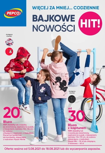 {loadposition linkPepco2} 'Bajkowe nowości' - nowa gazetka promocyjna sieci sklepów Pepco. Polecane promocje z gazetki Pepco: Bluza dziewczęca lub chłopięca - 20 zł. Koszulka chłopięca z nadrukiem - 10 zł. Koszulka dziewczęca z nadrukiem - 8 zł. …