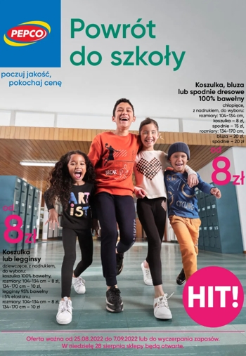 {loadposition linkPepco2} 'Powrót do szkoły' - najnowsza gazetka promocyjna sieci sklepów Pepco. Polecane promocje z gazetki Pepco: Koszulka dziewczęca z nadrukiem - 8 zł. Legginsy dziewczęce - 8 zł. Koszulka chłopięca z nadrukiem - 8 zł. Oferta…