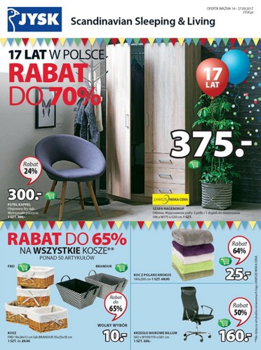 Nowa gazetka promocyjna sieci sklepów JYSK - "17 lat w Polsce". Polecane promocje z gazetki Jysk: Rabat do 65% na wszystkie kosze. Rabat 20% na wszystkie łóżka kontynentalne. Rabat 20-40% na wybrane kredensy. Oferta…