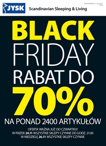 'Black Friday' - nowa gazetka promocyjna sieci sklepów JYSK. Polecane promocje z gazetki Jysk: Rabat 20-40% na szeroki wszystkie szafy. Rabat 20-50% na wszystkie komody i kredensy. Rabat 20-60% na wszystkie materace serii Gold. …
