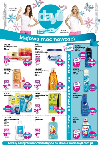 Nowa gazetka promocyjna drogerii Dayli - "Majowa moc nowości". Polecane promocje z magazynu Dayli: Krem do twarzy Eveline Mezo Lifting 50 ml - 17,99 zł. Krem odżywczy Nivea 50 ml - 7,99 zł. Odżywka do paznokci Bielenda 11…