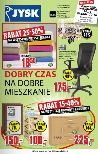 Nowa gazetka promocyjna JYSK - "Dobry czas na dobre mieszkanie". Polecane promocje z gazetki Jysk: Rabat 25-50% na wszystkie prześcieradła. Rabat 15-40% na wszystkie komody i kredensy. Rabat 20-40% na wszystkie krzesła barowe. Oferta ważna od 7.11…