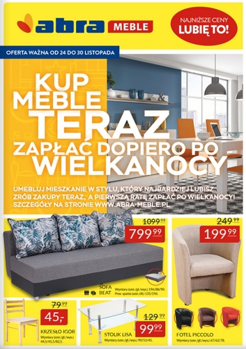 Nowa gazetka promocyjna sieci sklepów Abra Meble - "Kup meble teraz, zapłać dopiero po Wielkanocy". Polecane promocje z gazetki Abra Meble: Sofa BEAT - 799,99 zł. Krzesło IGOR - 45 zł. Stolik LISA - 99,99 zł.…