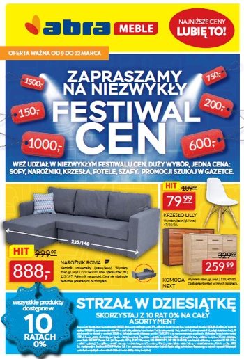 'Zapraszamy na niezwykły festiwal cen' - nowa gazetka promocyjna sieci sklepów Abra Meble. Polecane promocje z gazetki Abra Meble: Narożnik ROMA - 888 zł. Krzesło LILLY - 79,99 zł. Komoda NEXT - 259,99 zł. Ścianka…