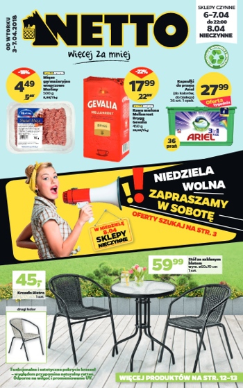 {loadposition linkNetto} 'Niedziela wolna! Zapraszamy w sobotę!' - nowa gazetka promocyjna sieci sklepów Netto. Polecane promocje z gazetki Netto: Krzesło Bistro - 45 zł. Stół ze szklanym blatem - 59,99 zł. Kawa mielona Mellanrost Brygg Gevalia 450 g -…