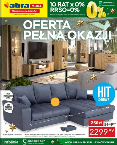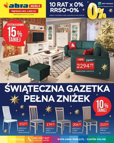 'Świąteczna gazetka pełna zniżek' - nowa gazetka promocyjna sieci sklepów Abra Meble. Polecane promocje z gazetki Abra Meble: Narożnik Kirsten - 2294,99 zł. Krzesło Emma - 152,99 zł. Krzesło Niko - 179,99 zł. Oferta ważna od środy…