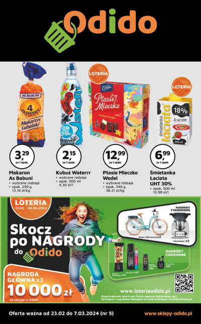 'Loteria' - nowa gazetka promocyjna sklepów Odido. Polecane promocje z gazetki Odido: Makaron As Babuni 250 g - 3,29 zł. Kubuś Waterrr 500 ml - 2,15 zł. Ptasie mleczko Wedel 340 g -12,99 zł. Oferta ważna od piątku…