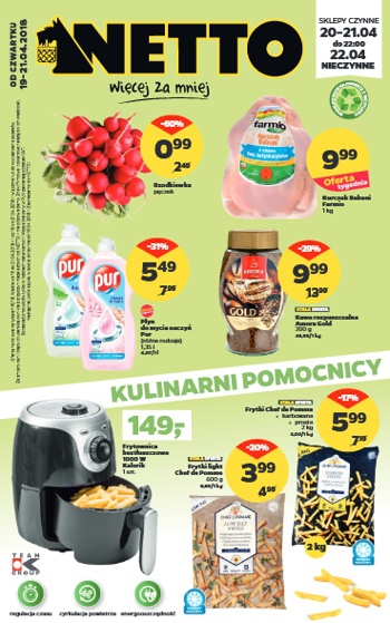 {loadposition linkNetto} 'Kulinarni pomocnicy' - nowa gazetka promocyjna sieci sklepów Netto. Polecane promocje z gazetki Netto: Frytownica beztłuszczowa Kalorik 1000 W - 149 zł. Frytki light Chef de Pomme 600 g - 3,99 zł. Kurczak Babuni Farmio 1 kg…