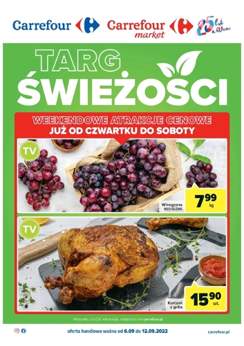 {loadposition linkCarrefour} 'Targ świeżości' - nowa gazetka promocyjna sieci marketów Carrefour. Polecane promocje z gazetki Carrefour: Winogrona Red Globe 1 kg - 7,99 zł. Kurczak z grilla 1 sztuka - 15,90 zł. Noga z kaczki z żurawiną wolno gotowana…