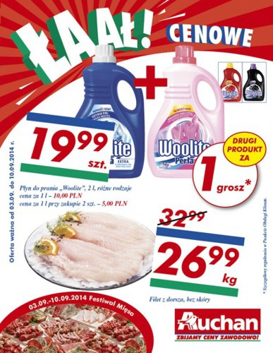 {loadposition linkAuchan} Nowa gazetka promocyjna Auchan - "Łaał! cenowe". Polecane promocje z gazetki Auchan: Płyn do prania Woolite 2x2 L - 20 zł. Filet z dorsza bez skóry 1 kg - 26,99 zł. Kurczak zagrodowy 1 kg - 9,99…
