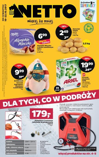 {loadposition linkNetto} Nowa gazetka promocyjna sieci sklepów Netto - "Dla tych, co w podróży". Polecane promocje z gazetki Netto: Kompresor z zestawem końcówek do pompowania 1100 W - 179 zł. Alpejskie Mleczko Milka 330 g - 6,99 zł.…