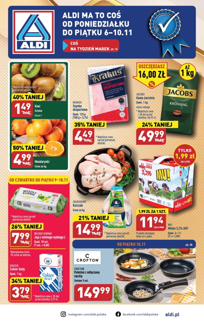 {loadposition linkAldi} 'Coś na tydzień marek' - nowa gazetka promocyjna sieci sklepów Aldi. Polecane promocje z gazetki Aldi: Szynka Eksportowa Krakus 120 g - 4,49 zł. Kawa ziarnista Jacobs 1 kg - 49,99 zł. Kurczak zagrodowy z Podlasia 1…