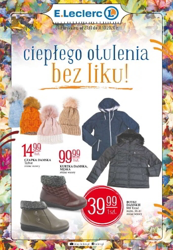 {loadposition linkEleclerc} 'Ciepłego otulenia bez liku!' - nowa gazetka promocyjna sieci handlowej E.Leclerc. Polecane promocje z gazetki E.Leclerc: Czapka damska Terbut - 14,99 zł. Kurtka damska lub męska - 99,99 zł. Botki damskie J&J Trend - 39,99 zł. …