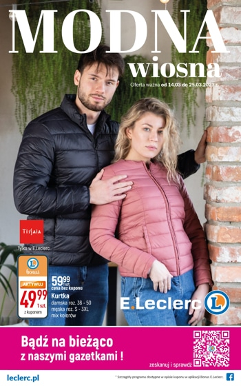 {loadposition linkEleclerc} 'Modna wiosna' - nowa gazetka promocyjna sieci handlowej E.Leclerc. Polecane promocje z gazetki E.Leclerc: Kurtka damska lub męska - 49,99 zł*. Spodnie damskie jeans - 49,99 zł. Spodnie dresowe damskie - 49,99 zł. * - cena…
