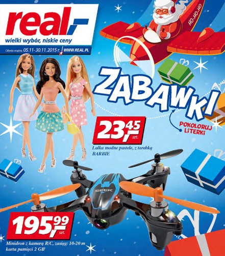 Nowa gazetka promocyjna sieci handlowej Real - "Zabawki". Polecane promocje z gazetki Real: Lalka Barbie - 23,45 zł. Minidron z kamerą - 195,99 zł. Nano Quadcopter zdalnie sterowany - 84,99 zł. Oferta ważna od 5.11 do 30.11.