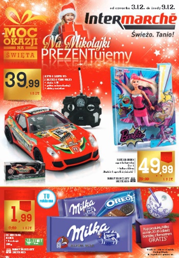 {loadposition linkIntermarche} Nowa gazetka promocyjna sieci handlowej Intermarche - "Na Mikołajki prezentujemy". Polecane promocje z gazetki Intermarche: Auto sportowe zdalnie sterowane - 39,99 zł. Lalka Barbie - 49,99 zł. Czekolada Milka 100 g - 1,99 zł. Oferta ważna…