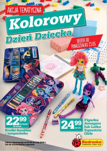 {loadposition linkBiedronka} Nowa gazetka promocyjna sieci handlowej Biedronka - "Kolorowy Dzień Dziecka". Polecane promocje z gazetki sieci Biedronka: Kredki Bambino 18 sztuk + temperówka - 22,99 zł. Figurka Avengers - 24,99 zł. Lalka Equestria Girls - 24,99 zł. …