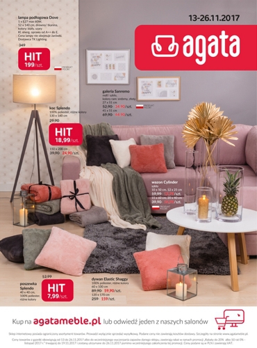 {loadposition linkAgata} Nowa gazetka promocyjna salonów meblowych Agata z artykułami wyposażenia wnętrz. Polecane promocje z gazetki Agata: Lampa podłogowa Dove - 199 zł. Koc Splendo 130x160 cm - 18,99 zł. Poszewka Splendo 40x40 cm - 7,99…