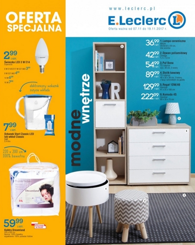 {loadposition linkEleclerc} Nowa gazetka promocyjna sieci handlowej E.Leclerc - "Modne wnętrze". Polecane promocje z gazetki E.Leclerc: Lampa ceramiczna Altom - 36,99 zł. Dywan poliamidowy Omega 120x160 cm - 42,99 zł. Stolik kawowy TS Interior - 89,99 zł. …