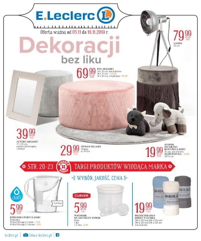 {loadposition linkEleclerc} 'Dekoracji bez liku' - nowa gazetka promocyjna sieci handlowej E.Leclerc. Polecane promocje z gazetki E.Leclerc: Puf Aksamit - 69,99 zł. Lampa - 79,99 zł. Dywan Milano - 29,99 zł. Oferta ważna od wtorku…