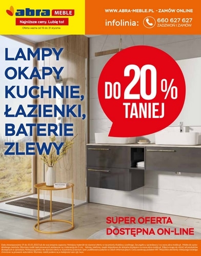 {loadposition linkAbra} 'Lampy, okapy, kuchnie, łazienki, baterie i zlewy' - nowa gazetka promocyjna sieci sklepów Abra Meble. Polecane promocje z gazetki Abra Meble: Lampa Diamond - 59,99 zł. Kuchnia Vigo 260 - 1999 zł. Zlew Kreta - 339 zł.…