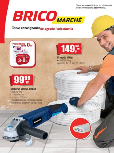 {loadposition linkBricomarche} Nowa gazetka promocyjna Bricomarche. Polecane promocje z gazetki Bricomarche: Przewód YDYp 100 mb - 149 zł. Szlifierka kątowa Einhell - 99,99 zł. Lampa podłogowa - 44,99 zł. Oferta ważna od 30.07 do 10.08 lub do wyczerpania…