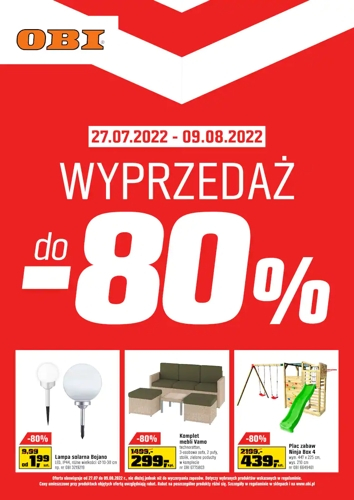{loadposition linkObi} 'Wyprzedaż do -80%' - nowa gazetka promocyjna sieci marketów Obi. Polecane promocje z gazetki Obi: Lampa solarna Bojano - od 1,99 zł. Komplet mebli Vamo - 299 zł. Plac zabaw Ninja Box 4 - 439 zł. …