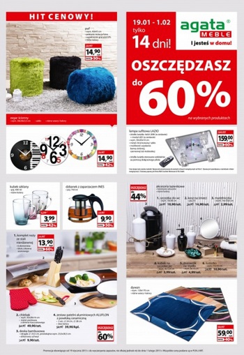 {loadposition linkAgata} Nowa gazetka promocyjna Agata Meble - "Oszczędzasz do 60%". Polecane promocje z gazetki Agata Meble: Zegar ścienny - 14,90 zł. Lampa sufitowa Lazio - 159 zł. Dzbanek z zaparzaczem Ines - 9,90 zł. Oferta ważna od…