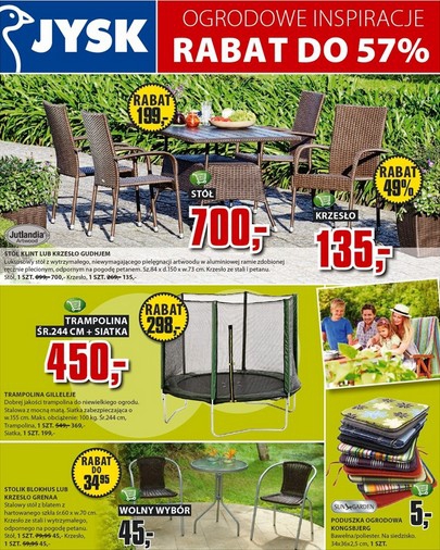 Nowa gazetka promocyjna JYSK - "Meble ogrodowe, rabat do 50%". Polecane promocje z gazetki Jysk: Rabat 25-50% na wszystkie poduszki ogrodowe. Rabat 20-40% na wszystkie lampy ogrodowe. Rabat 20-40% na wszystkie akcesoria kuchenne. Oferta ważna od 23.04…