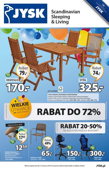 Nowa gazetka promocyjna JYSK. Polecane promocje z gazetki Jysk: Rabat 20-50% na wszystkie krzesła biurowe. Rabat 20-50% na wszystkie lampy ogrodowe. Rabat 20-40% na wszystkie narzuty. Oferta ważna od 4.06 do 17.06.