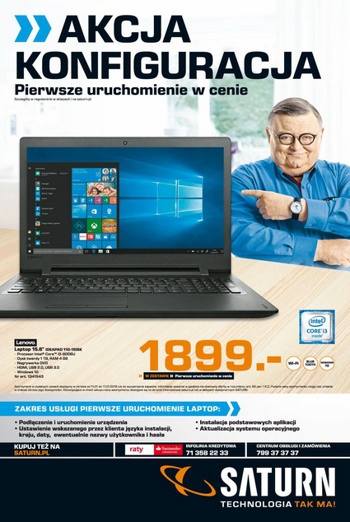 {loadposition linkMediaMarkt} Nowa gazetka promocyjna Saturn - "Akcja konfiguracja". Polecane promocje z gazetki Saturn: Laptop LENOVO Ideapad 110-15ISK - 1899 zł. Laptop/Tablet 2w1 LENOVO Miix 320-10ICR 80XF00F0PB - 999 zł. Laptop ACER Aspire 1 A114-31-P47C N4200 - 1599 zł.…