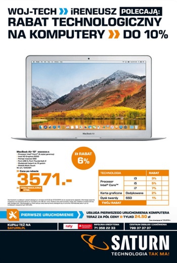 {loadposition linkMediaMarkt} 'Rabat technologiczny na komputery do 10%' - nowa gazetka promocyjna Saturn. Polecane promocje z gazetki Saturn: Laptop APPLE MacBook Air 13 MQD32ZE - 3571 zł. Laptop ASUS VivoBook Max F541UJ-DM493T - 1994 zł. Laptop ACER Aspire 5…