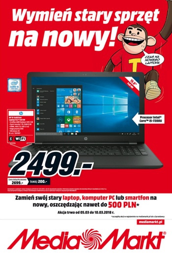 {loadposition linkMediaMarkt} 'Wymień stary sprzęt na nowy!' - nowa gazetka promocyjna Media Markt. Polecane promocje z gazetki Media Markt: Laptop HP 15-bs027nw 2HP52EA - 2499 zł. Laptop KIANO SlimNote 14.2+ x5-Z8350 - 829 zł. Laptop ACER Aspire 3 A315-31-C3T4…