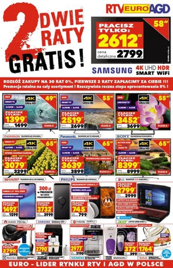 'Dwie raty gratis!' - nowa gazetka promocyjna RTV EURO AGD. Polecane promocje z gazetki RTV EURO AGD: Laptop Acer Aspire Nitro 5 - 2799,07 zł. Telewizor 4K Ultra HD 58 cali Samsung UE58MU6192 - 2612,40 zł. Smartfon Huawei…