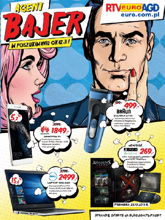 Katalog RTV EURO AGD - "Agent Bajer w poszukiwaniu okazji!". Polecane promocje z katalogu RTV EURO AGD: Smartfon Huawei P8 - 1799 zł. Golarka Braun CT4S - 499 zł. Laptop Dell 5558-3567 - 2499 zł. Oferta ważna…