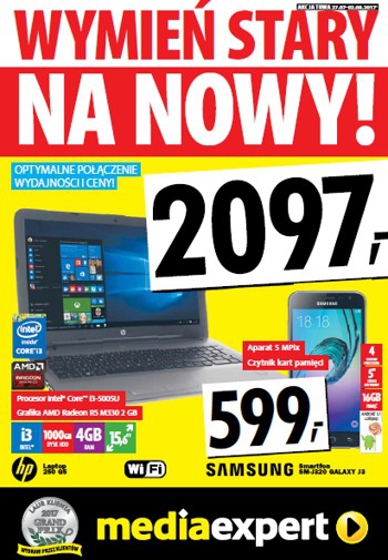 {loadposition linkMediaExpert} Nowa gazetka promocyjna Media Expert - "Wymień stary na nowy!". Polecane promocje z gazetki Media Expert: Laptop HP 250 G5 - 2097 zł. Smartfon SAMSUNG Galaxy J3 - 599 zł. Laptop KIANO Intelect X3 - 799…