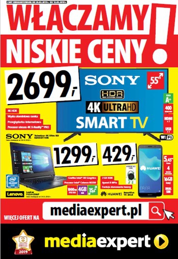 {loadposition linkMediaExpert} 'Włączamy niskie ceny!' - nowa gazetka promocyjna sieci sklepów Media Expert. Polecane promocje z gazetki Media Expert: Telewizor 4K Ultra HD 55 cali SONY KD-55XF7096 - 2699 zł. Laptop LENOVO V110-15IAP - 1299,99 zł. Smartfon HUAWEI Y5…