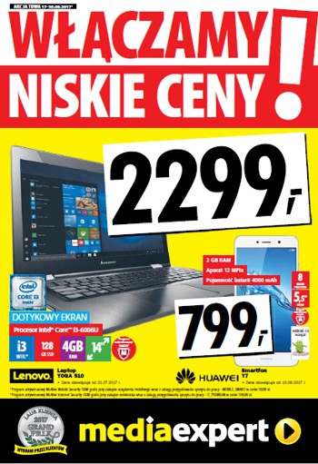 {loadposition linkMediaExpert} Nowa gazetka promocyjna sieci sklepów Media Expert - "Włączamy niskie ceny!". Polecane promocje z gazetki Media Expert: Laptop LENOVO Yoga 510-14ISK - 2299 zł. Smartfon HUAWEI Y7 - 799 zł. Soundbar JBL SB450 - 2599 zł. …